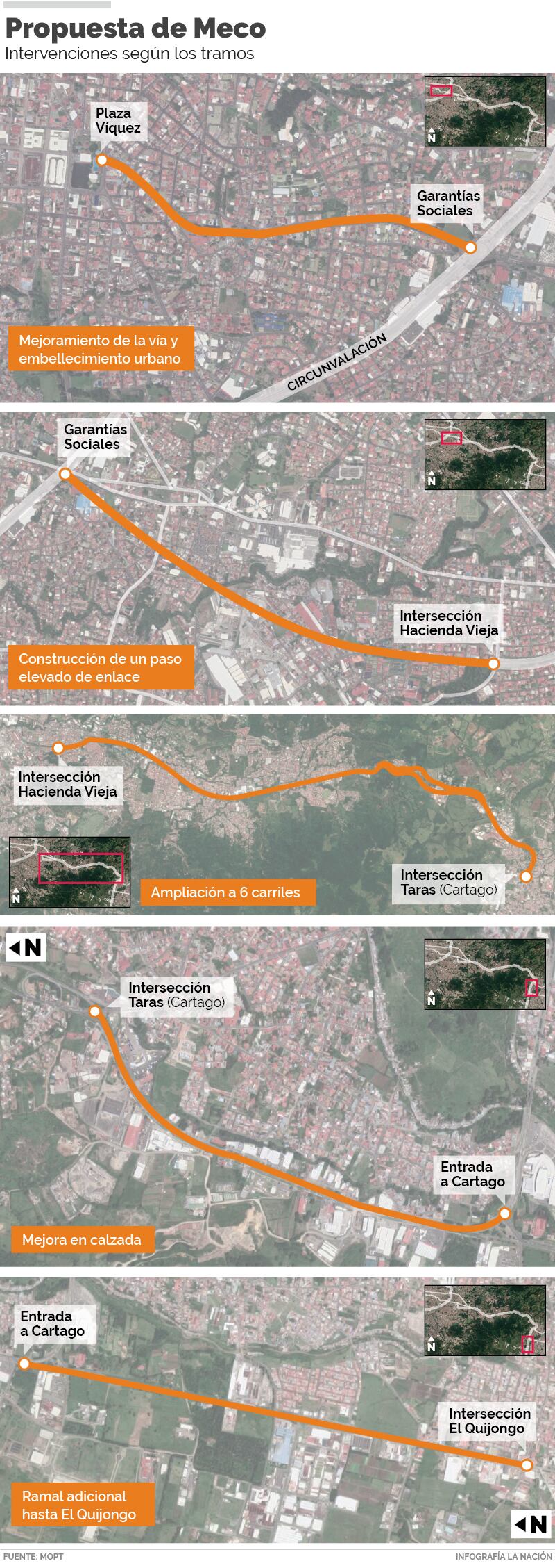 La carretera sería renovada de Taras a la intersección de La Lima. A partir de este punto, las mejoras llegarían por un lado hasta la entrada al centro de Cartago, y por el otro hasta El Quijongo, en Tejar de El Guarco.