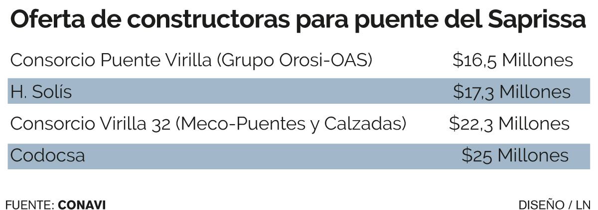 En el caso del puente del Saprissa, la construcción fue otorgada al consorcio integrado por las constructoras MECO y Puentes y Calzadas por $22,3 millones. Mientras que el viaducto de las Garantías Sociales fue asignado a MECO por $17 millones.