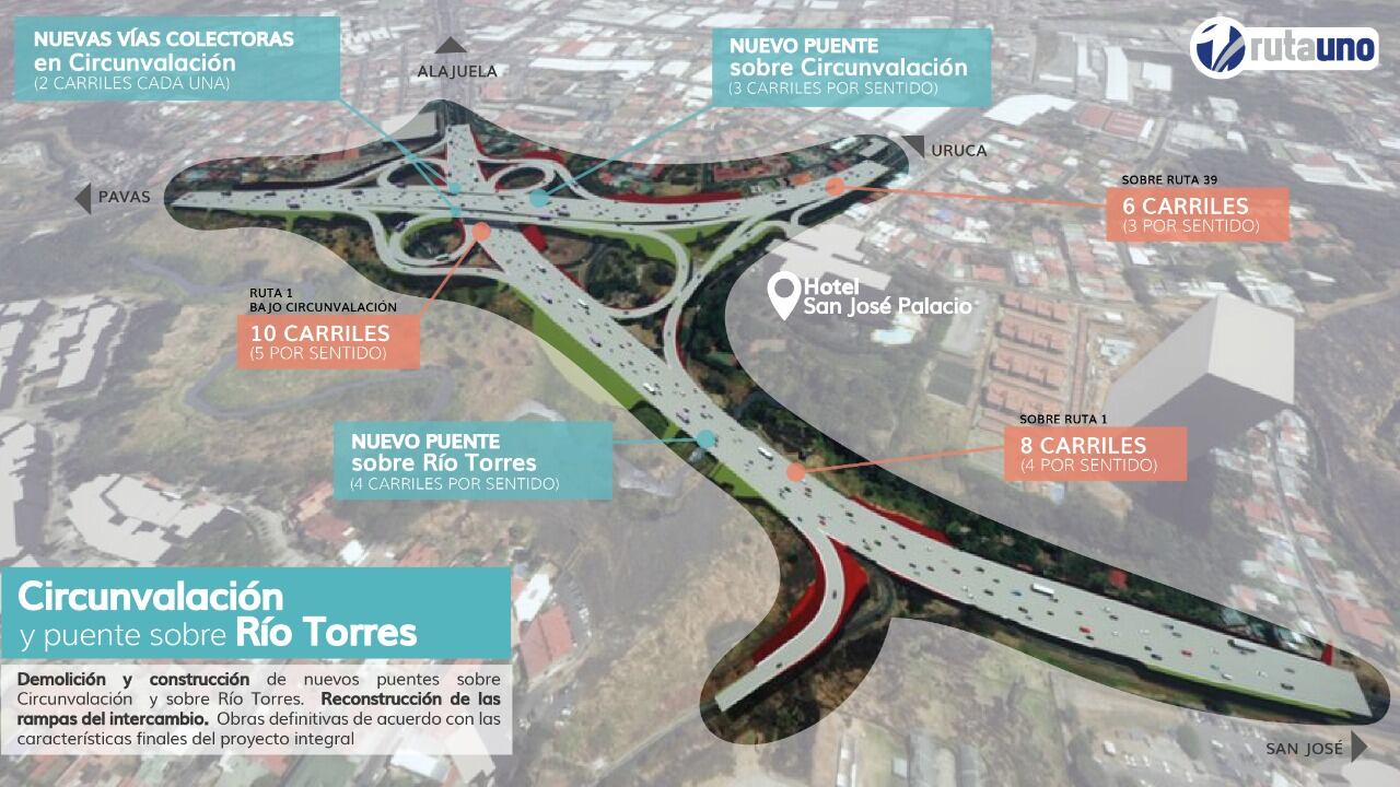 Los trabajos inmplican aumentar las vías de acceso vehicular en el caso del sector del Monumento al Agua, sobre la carretera de Circunvalación. Entretanto, el puente sobre el río Torres, en la autopista General Cañas, deberá ampliarse a ocho carriles, cuatro por sentido.