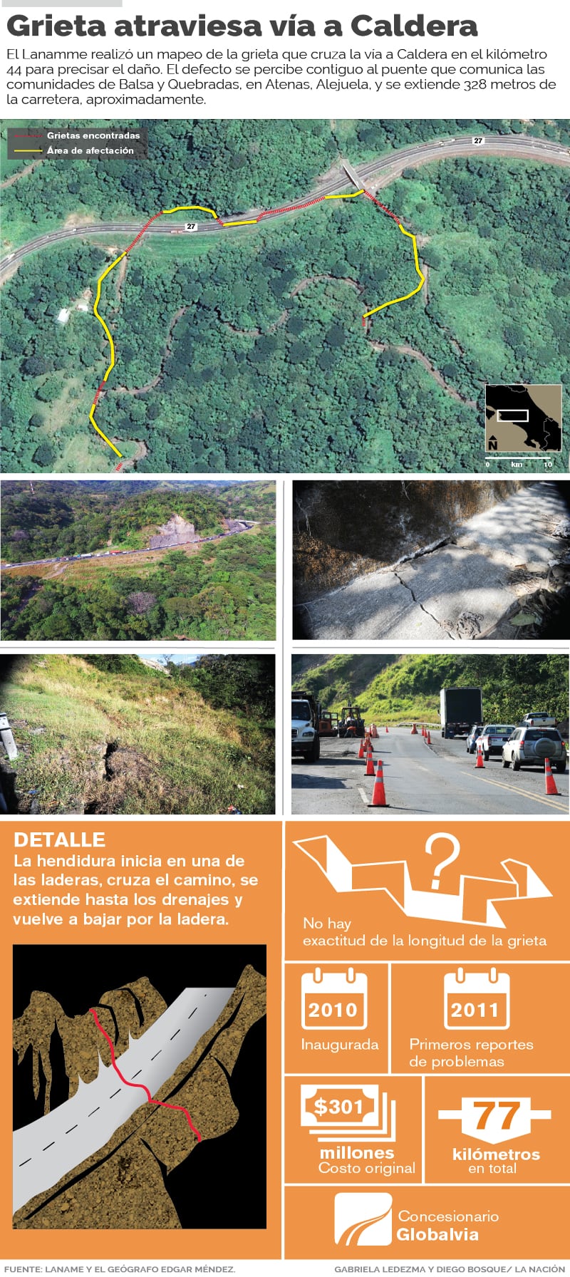 “Resultan evidentes las deformaciones y los asentamientos diferenciales que están teniendo lugar en el sitio (km 44) . Las grietas tienen patrones de entrada y de salida en el pavimento muy bien definidos”, expresó Lanamme en el escrito enviado al CNC y al MOPT.