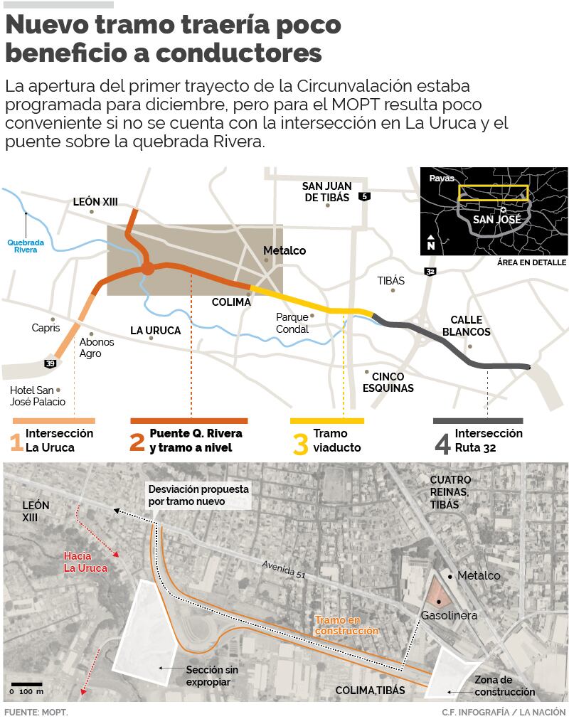 Para el jerarca del Ministerio de Obras Públicas y Transportes (MOPT), Rodolfo Méndez Mata el problema es que habilitar ese trayecto sin contar con el puente sobre la quebrada Rivera (que comprendía la subsección II A) y la intersección en la Uruca (que corresponde a la unidad funcional I) sería “para decir simplemente que se abrió”, pues no representaría ningún beneficio para los conductores.