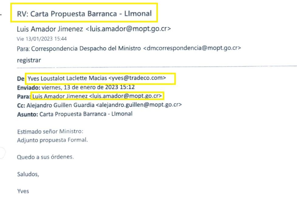 Aunque nunca obtuvo una respuesta por escrito, el 13 de enero, 22 días después de su primer viaje a territorio tico, Loustalot remitió al correo electrónico de Amador una propuesta formal para hacerse del millonario contrato. En ese correo fue copiado Alejandro Guillén, quien fungía en ese momento como viceministro de Infraestructura.