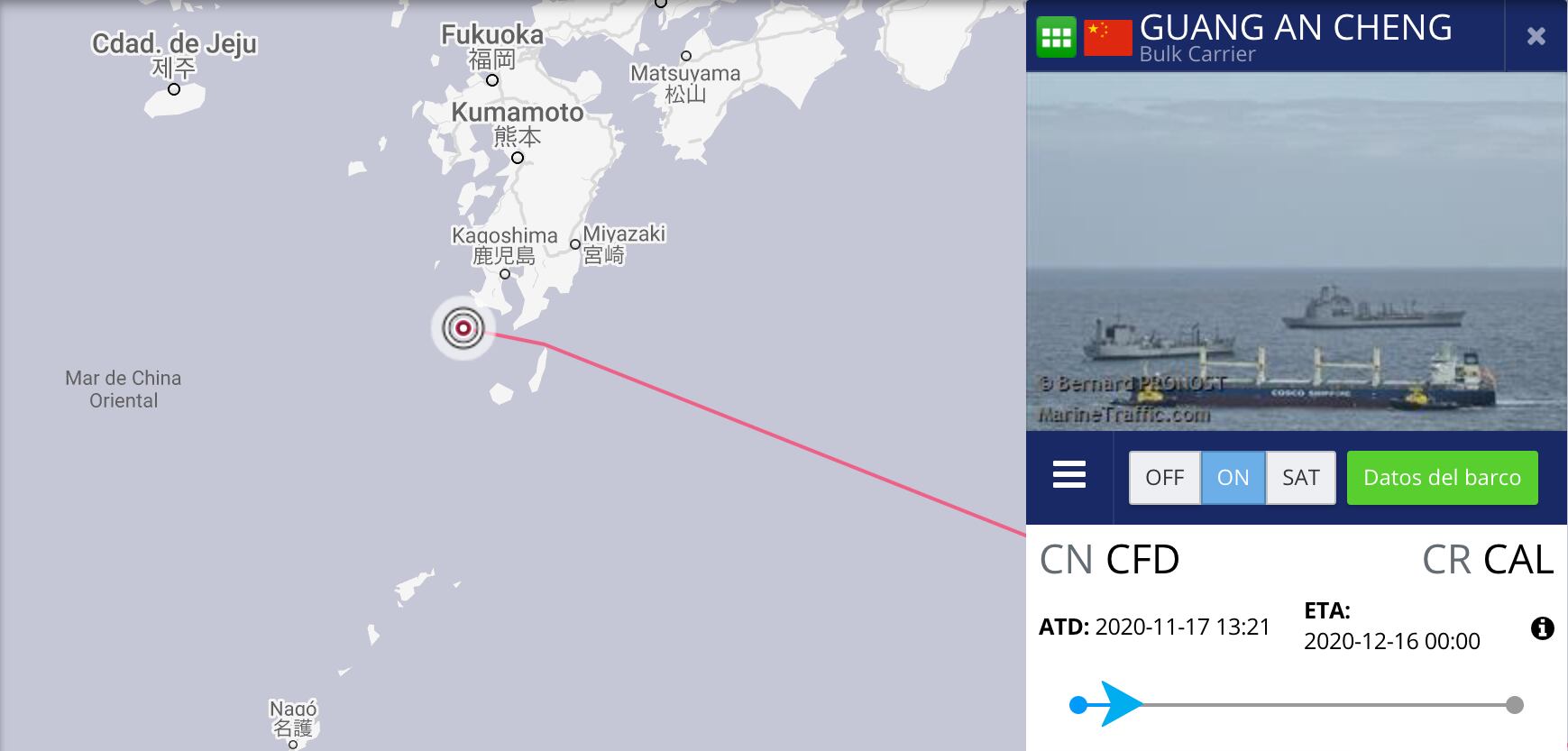 De acuerdo con la última posición del navío, registrada en sitio web marinetraffic.com, la embarcación se dirigía por aguas japoneses, adentrándose a alta mar, en el Pacífico.