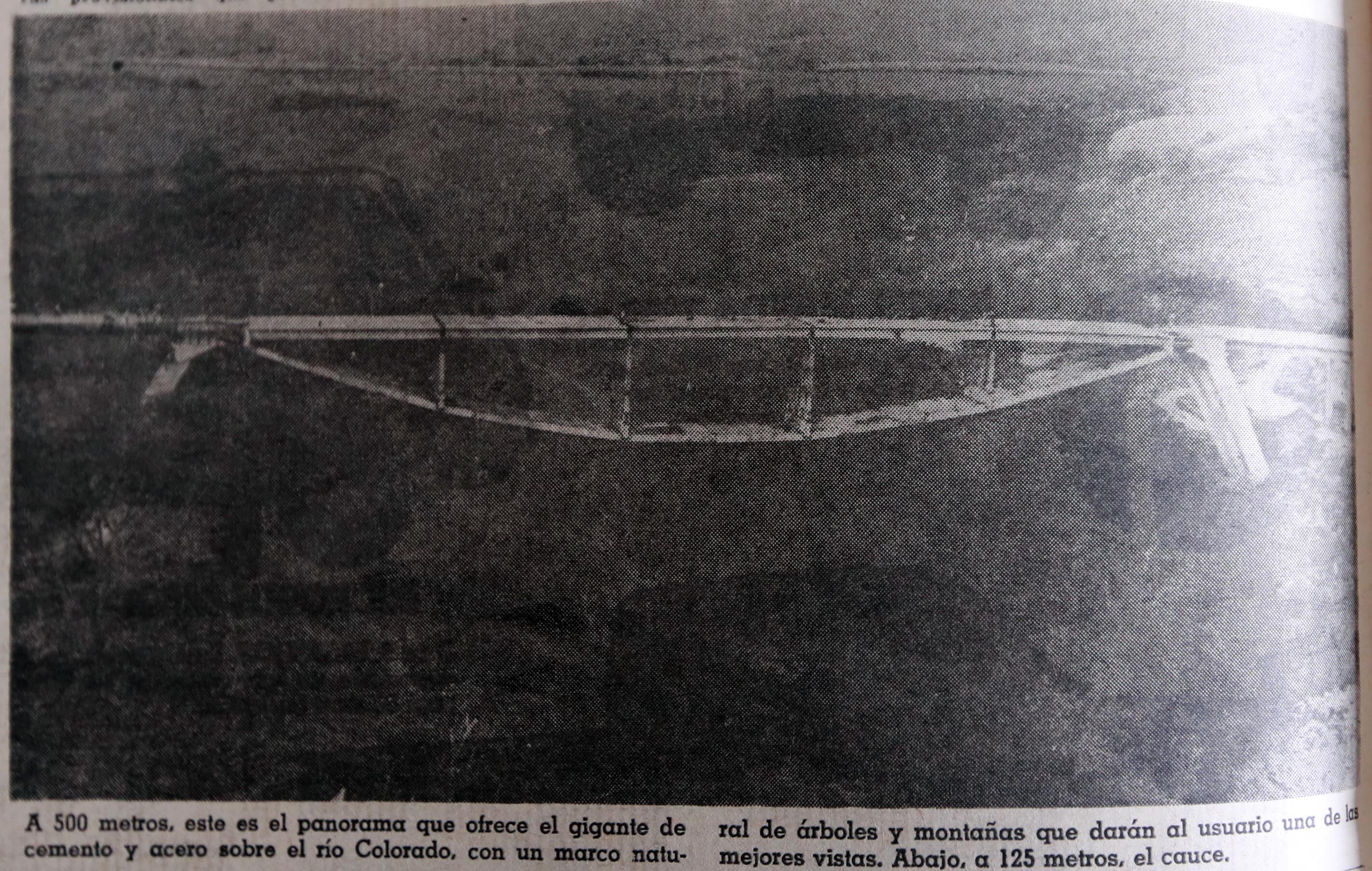 “La última viga de concreto de 25 metros de longitud y más de 35 toneladas de peso, engalanada con las banderas de Costa Rica y de los Estados Unidos, fue descendida, lentamente, mediante un complejo sistema de cables y poleas hasta el punto exacto donde le correspondía estar en el puente sobre el río Colorado. Quedó en esta forma terminada la estructura principal del mismo, faltando únicamente detalles complementarios para dar por terminada la obra.