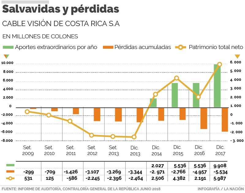 Por esta razón, el órgano contralor considera que Cable Visión de Costa Rica se constituyó en una empresa “patrimonialmente deteriorada”, pues en vez de fortalecer el negocio ha dejado pérdidas acumuladas por ¢5.534 millones, entre diciembre del 2014 y diciembre del 2017. Esa pérdida equivale a 48% de su patrimonio.