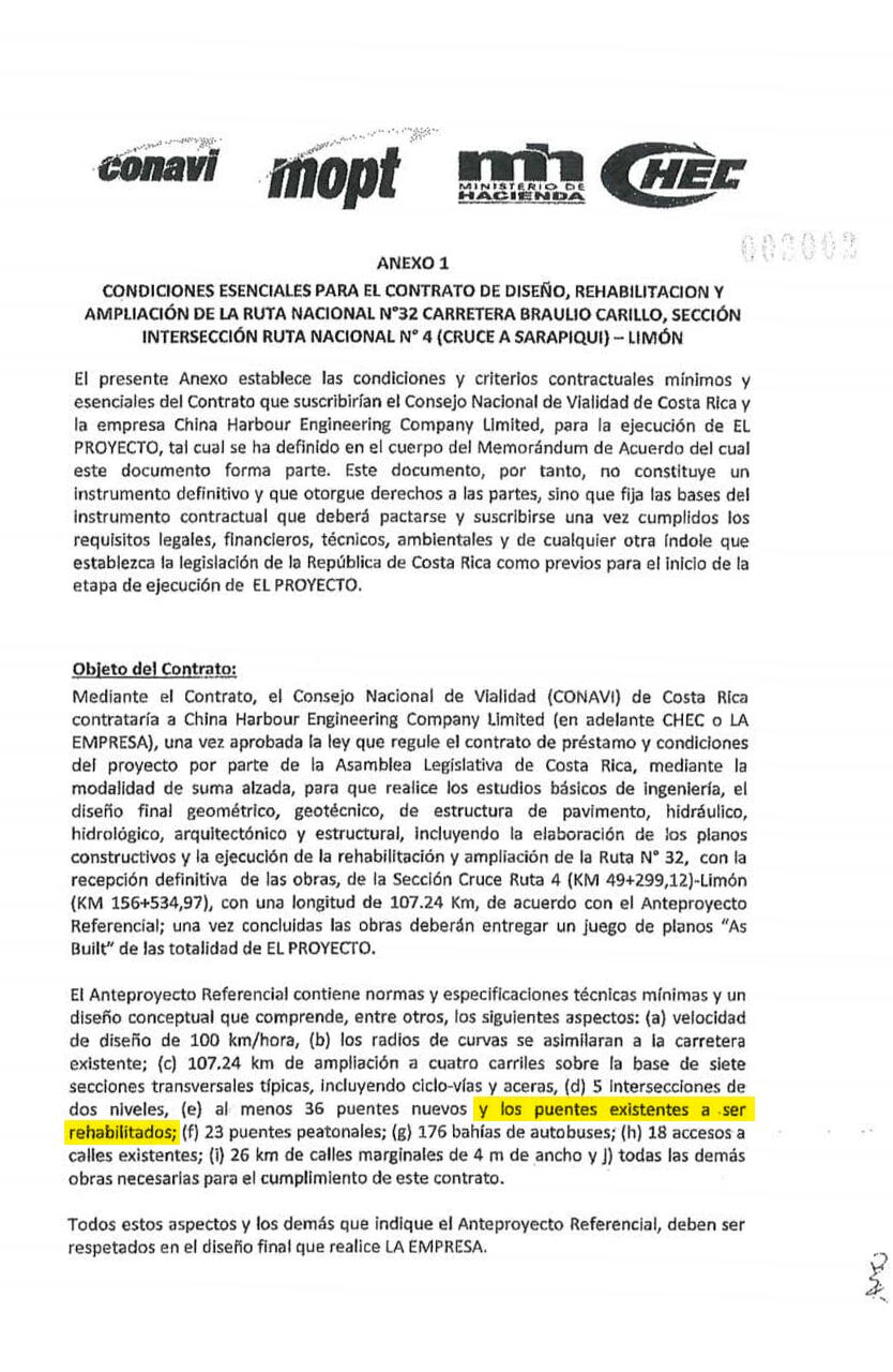 En ese memorándum, se indica en el objeto del contrato que el diseño final debía contemplar entre otros aspectos la construcción de “al menos 36 puentes nuevos y los puentes existentes a ser rehabilitados”.