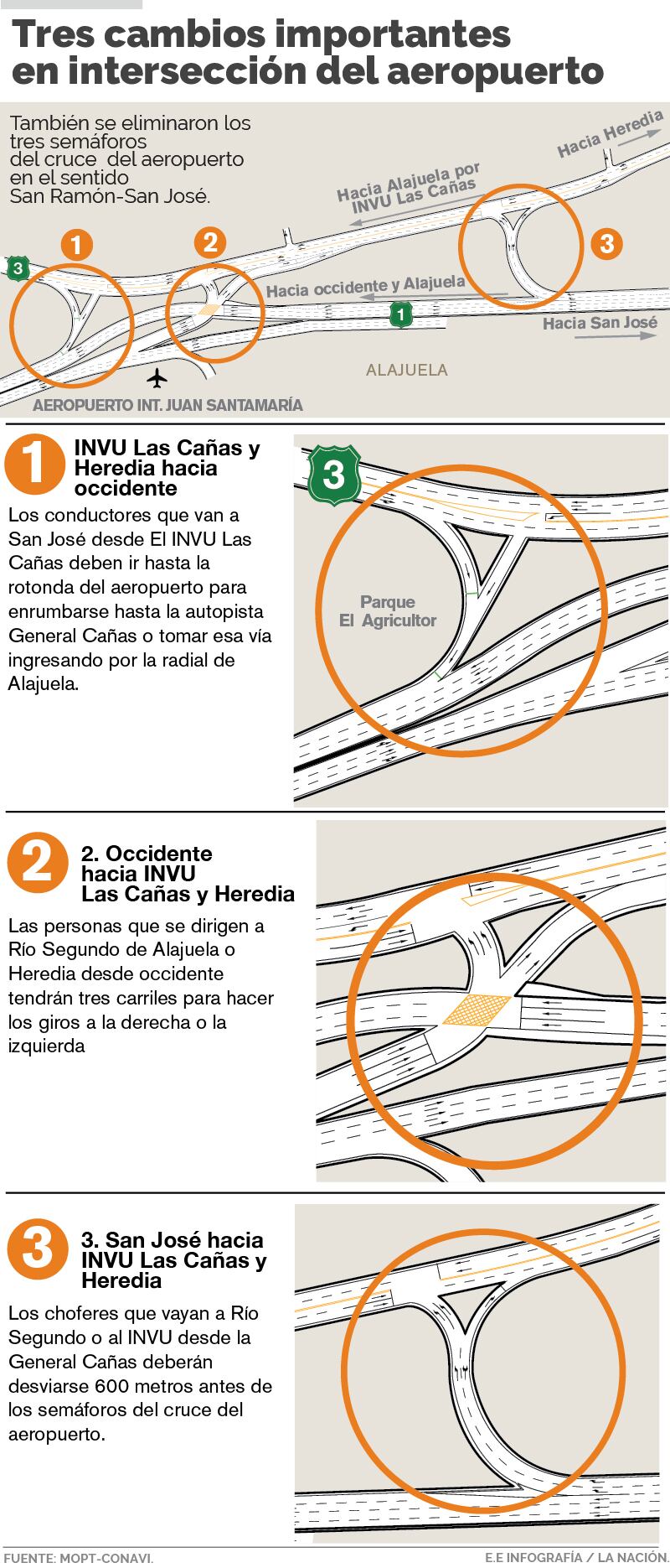 Se trata de la construcción de un lazo vial que permitirá a los choferes que van hacia Río Segundo de Alajuela –por la autopista General Cañas– desviarse 600 metros antes de los semáforos del cruce de la terminal aérea. Ese nuevo giro también les permitirá enrumbarse hacia el INVU-Las Cañas y el centro de Alajuela. Esa maniobra evitará que las personas pierdan tiempo en los semáforos.
