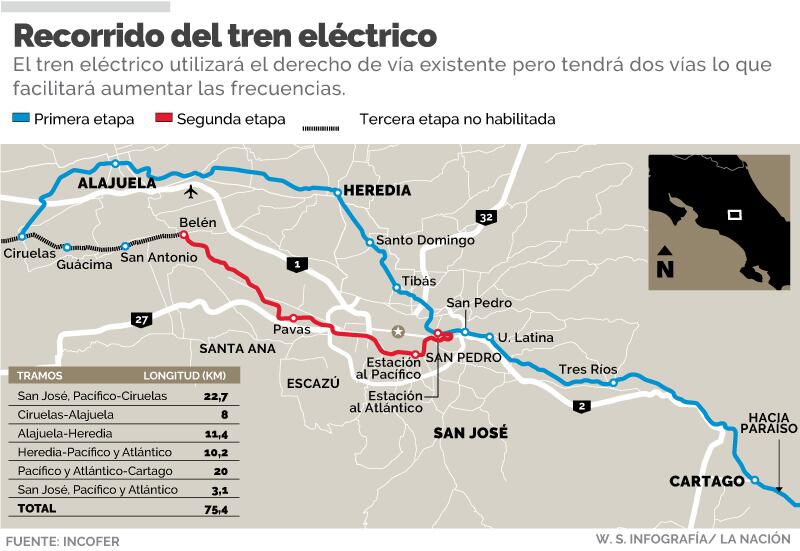 El tren eléctrico de pasajeros de la Gran Área Metropolitana recorrerá 73 kilómetros, pasará por 15 cantones y tendrá 42 estaciones.