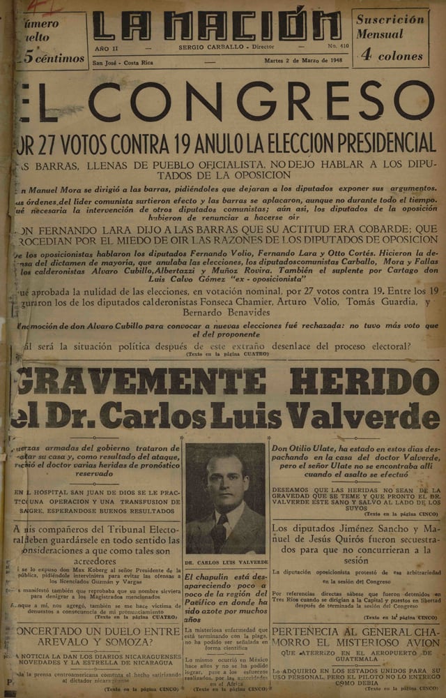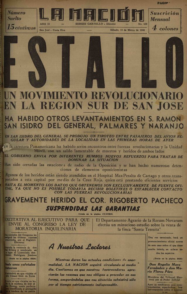 “Estalló un movimiento revolucionario en la región sur de San José”, se leía en una de las portadas mas memorables publicada por La Nación en su historia. No era para menos: un tiroteo entre pasajeros de un avión y autoridades de la localidad había sido el banderazo para la marcha del Ejército de Liberación Nacional, liderado por José Figueres Ferrer.
