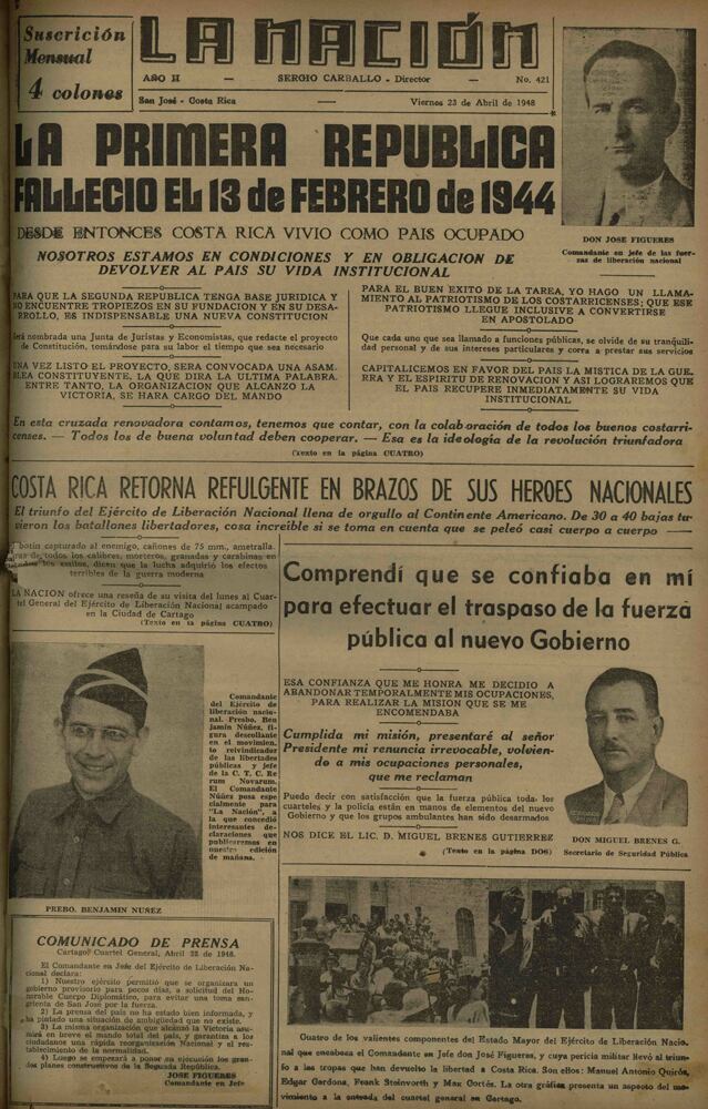 “La primera república falleció el 13 de febrero de 1944, desde entonces Costa Rica ha sido un país ocupado”, dijo Figueres Ferrer en una entrevista con La Nación publicada el 23 de marzo de aquel año. Se refería a las elecciones de cuatro años atrás, que se efectuaron entre polémicas de fraude y corrupción.
