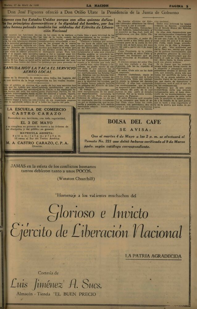 “Estalló un movimiento revolucionario en la región sur de San José”, se leía en una de las portadas mas memorables publicada por La Nación en su historia. No era para menos: un tiroteo entre pasajeros de un avión y autoridades de la localidad había sido el banderazo para la marcha del Ejército de Liberación Nacional, liderado por José Figueres Ferrer.