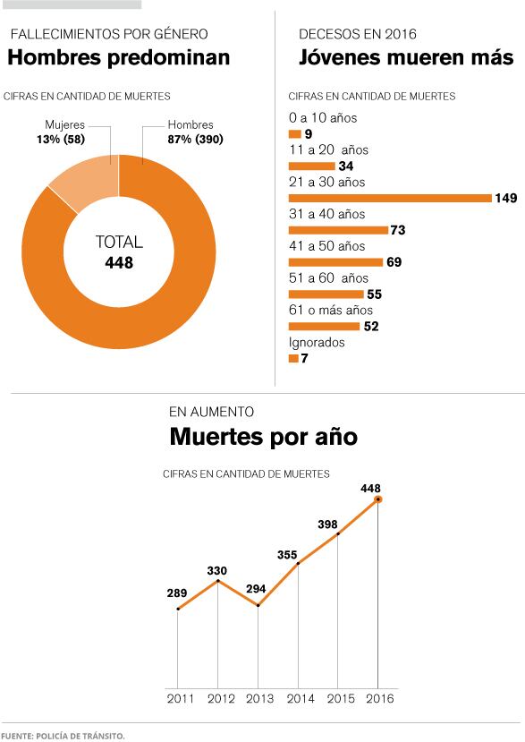 Total de muertes. Según datos de la Policía de Tránsito, el año anterior se contabilizaron 448 muertes por accidentes de tránsito; es decir, 60 más que en el 2015, 93 más que en el 2014 y 184 más que en el 2013.