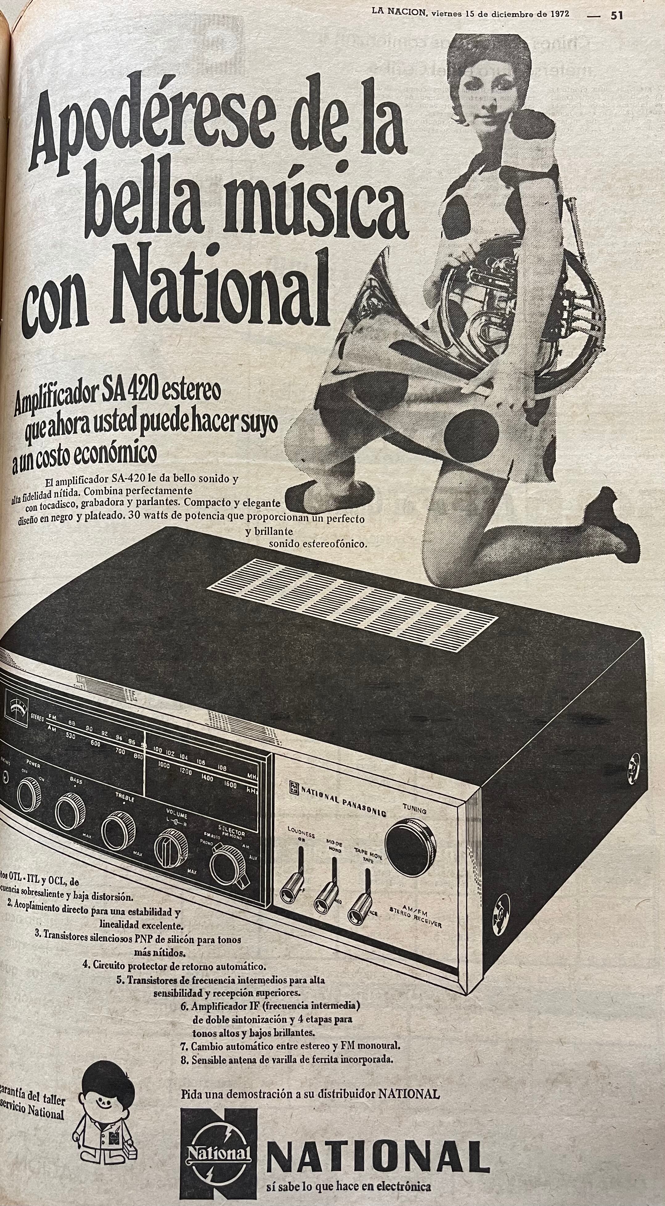Los equipos de sonido, para disfrutar de la música en la sala de la casa, se publicitaban con las marcas Crown o National (esta última hoy es Panasonic). Traían tocadiscos incorporado con varias velocidades según el acetato (33 rpm; 45 rpm y 78 rpm) y bafles de 28 pulgadas de alto para una potencia de hasta 30 watts. ¡Fuerza sónica!