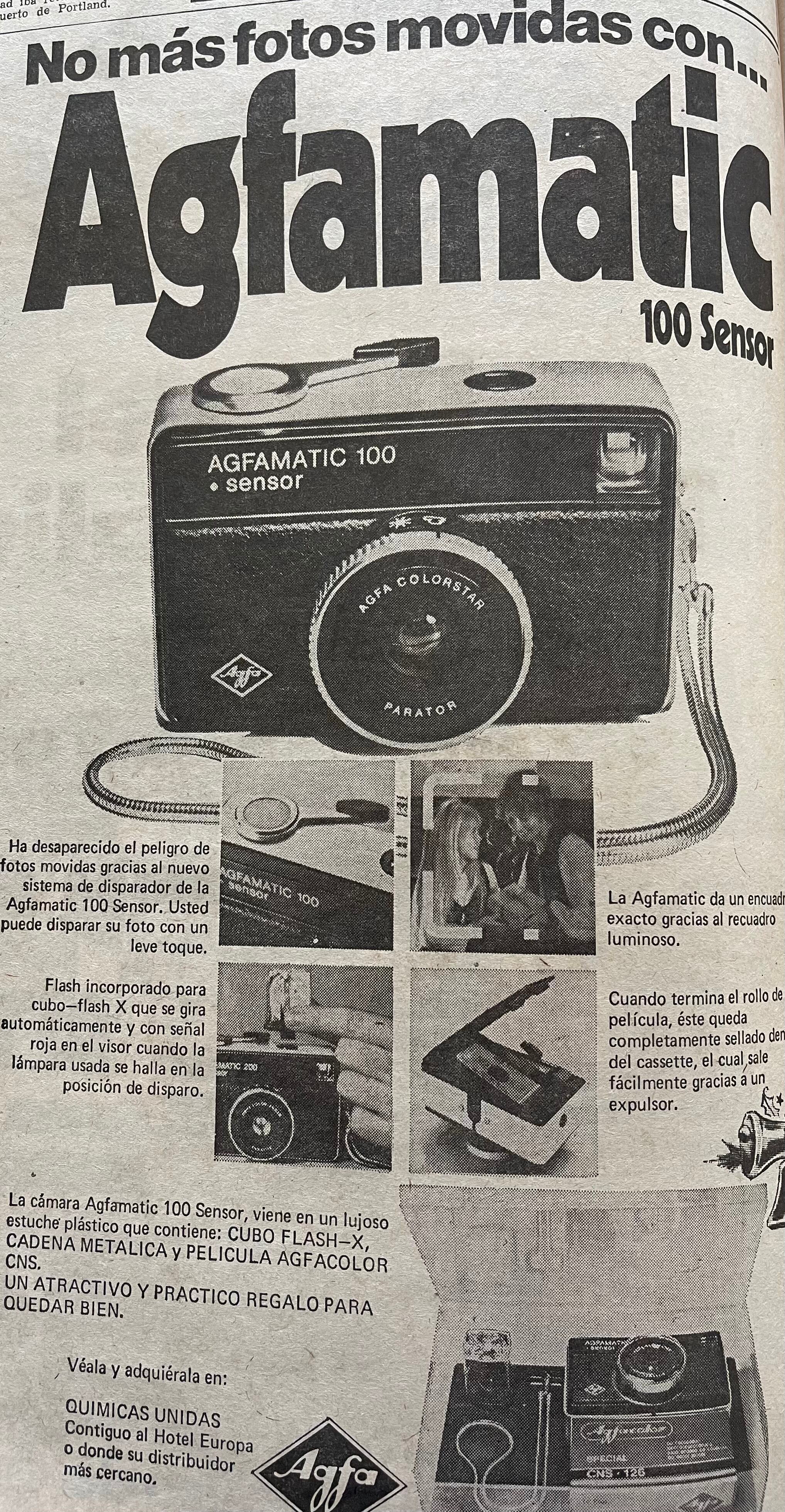 Agfa anunciaba su nuevo lanzamiento: la cámara portátil Agfamatic, con sensor 100 y flash incorporado para que “no tenga más fotos movidas”. Y otra novedad: cuando se terminaba el rollo de película, “este quedará completamente sellado dentro del cassette”, dice el anuncio.
