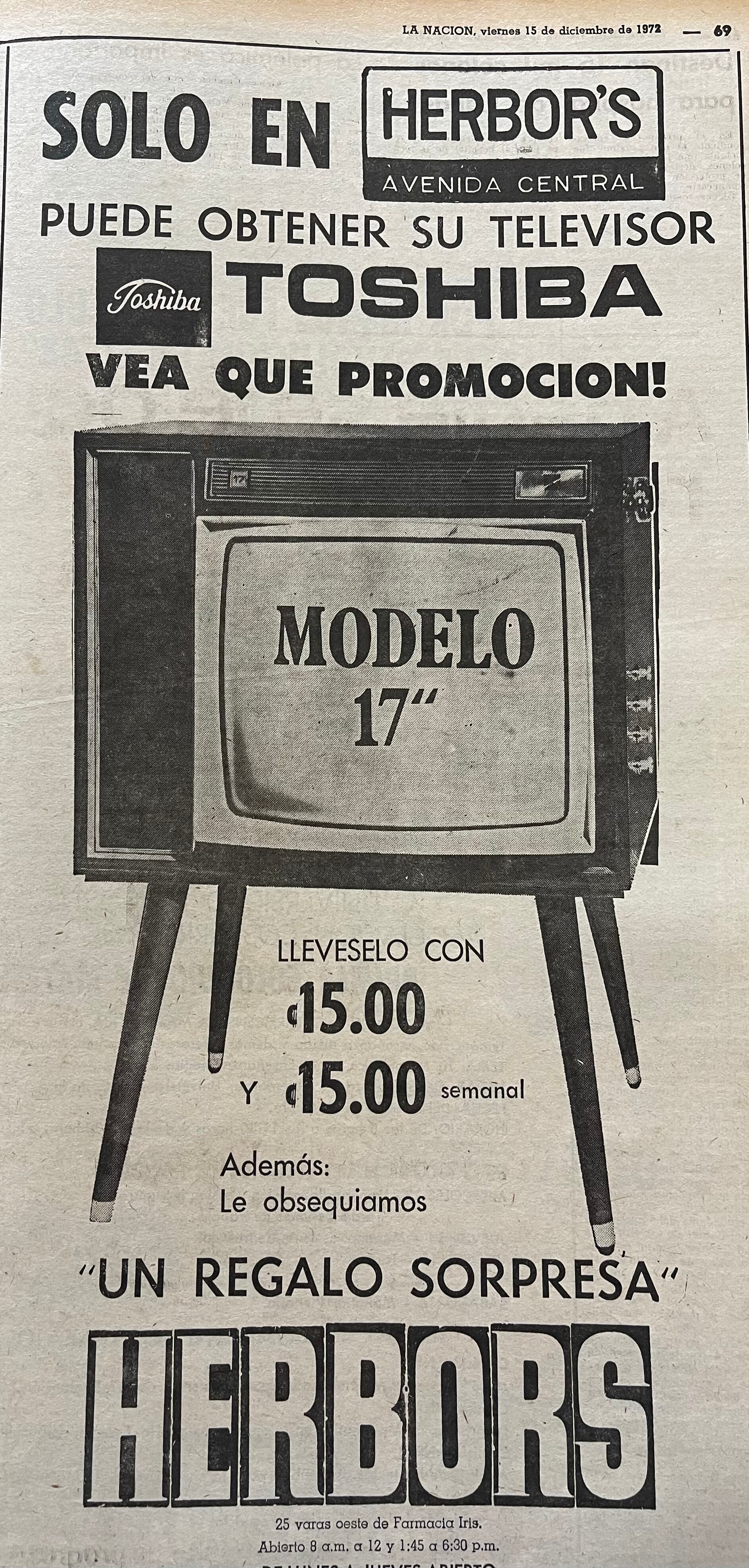 Los televisores de moda eran los “transistorizados”, la tecnología que vino a abolir los famosos “tubos al vacío”. Las marcas de punta eran Hitachi y Toshiba y tienda Herbor’s, también en avenida central, promocionaba el Toshiba con pantalla en blanco y negro, de 17 pulgadas, y en un mueble de cuatro patas, con pagos en cuotas de ¢15 por semana. Tienda Artelec ofrecía el Hitachi en cuotas de ¢23,75 para que los montos “no le quiten el sueño”.