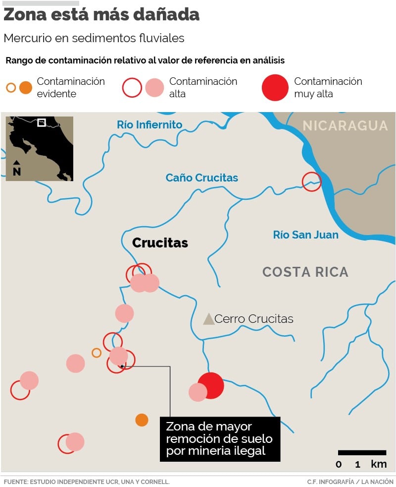 Según la investigación, tienen evidencia técnica y científica que demostraría un “alto grado de contaminación con mercurio como resultado de la minería ilegal en Crucitas”, por lo cual los investigadores solicitan al Estado tomar las medidas para frenar esa actividad y “contener los daños a mediano y largo plazo”.