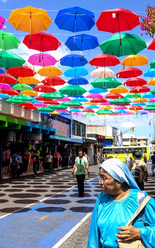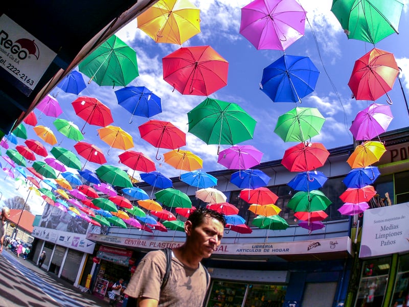 La paragüería Rego conmemora este año su 80 aniversario y, para ello, colocó 112 sombrillas de colores sobre la avenida 4 en San José, entre calle 8 y 10, en donde han mantenido su local desde 1954.