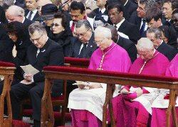 Multitud. Ya durante la misa, la presencia de dirigentes de las religiones más diversas, líderes de una enorme cantidad de países y la masa de unos 300.000 humanos que se agolparon en la plaza San Pedro conmovieron al Presidente, que sintió la ceremonia emotiva durante el saludo de la paz y hasta se le hizo "muy corta".