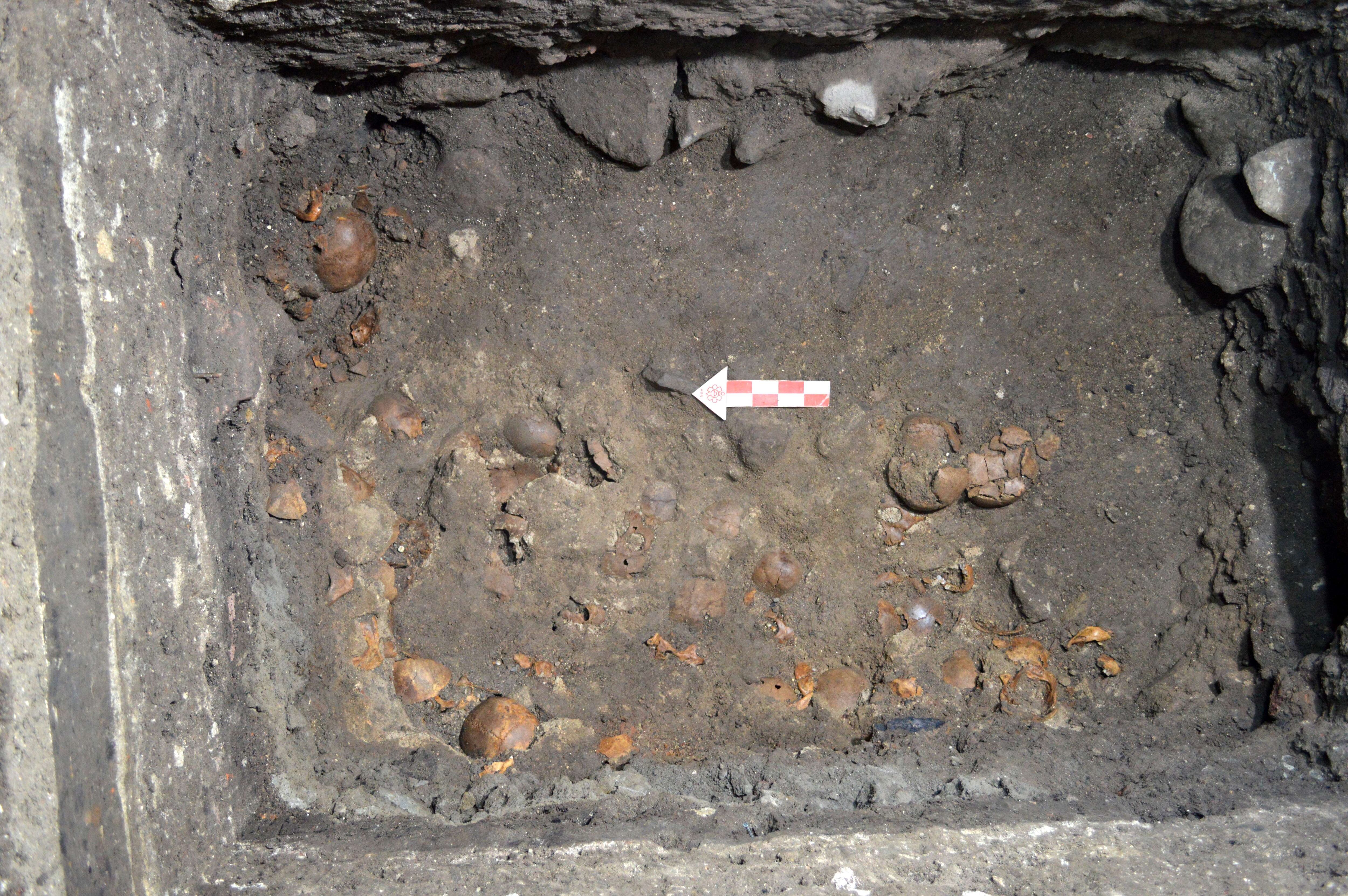 El altar de cráneos, de unos 45 centímetros de alto, fue hallado en el edificio de la calle de Guatemala, a unos metros del Templo Mayor, zona arqueológica aledaña al Zócalo de la Ciudad de México.