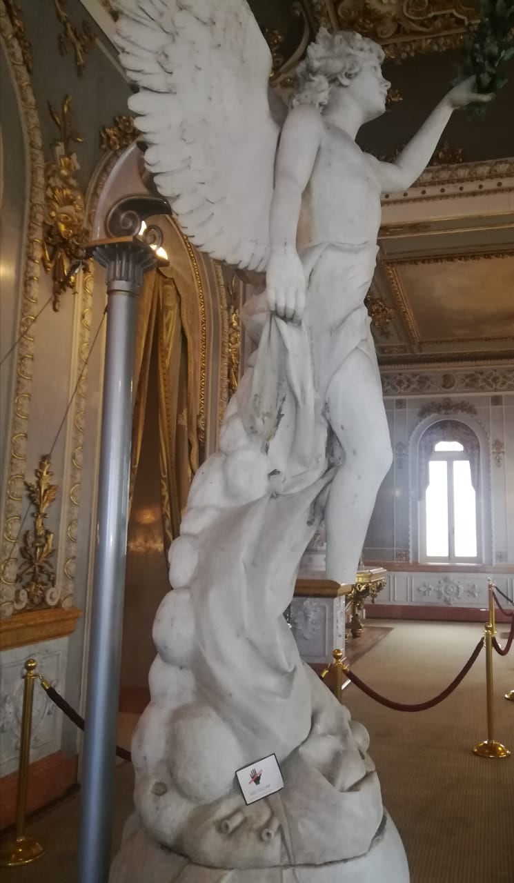 La escultura, hecha en mármol y atribuida al italiano Pietro Capurro, representa una figura alada que sostiene una corona de olivo, simbolizando el triunfo del artista.