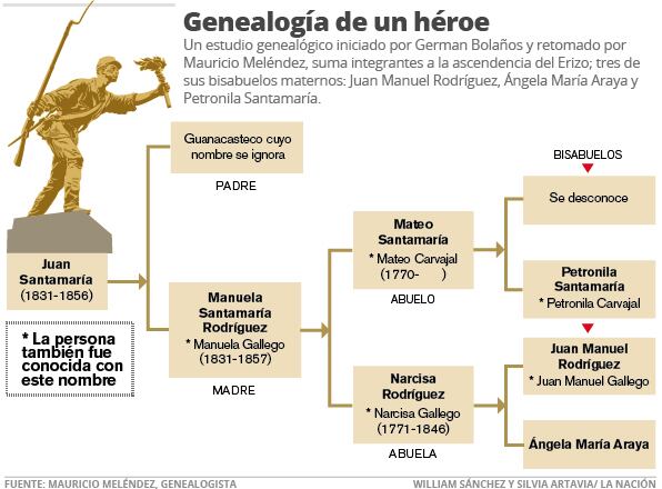 Se trata de Juan Manuel Rodríguez, Ángela María Araya (padres de la abuela de Juan) y Petronila Santamaría (madre del abuelo). El hallazgo lo contiene la investigación Genealogía ascendente de Juan Santamaría (1831-1856) , iniciada por el genealogista German Bolaños Zamora (ya fallecido) y posteriormente retomada por el también filólogo y lingüista Mauricio Meléndez.