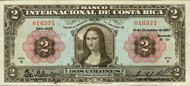 La Mona Lisa, la obra de arte más célebre del artista renacentista Leonardo Da Vinci, fue la figura central de un billete de ¢2, emitido en el año de 1931 por el Banco Internacional de Costa Rica, la primera entidad financiera del país netamente estatal y que unos años después pasaría a llamarse como le conocemos en la actualidad, Banco Nacional de Costa Rica.