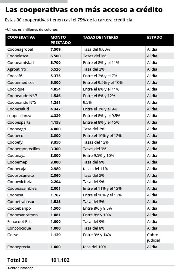 Treinta cooperativas concentran casi el 75% de la cartera crediticia del Instituto Nacional de Fomento Cooperativo (Infocoop). Entre ellas recibieron ¢100.000 millones de los ¢113.350 millones que tiene prestados el Instituto.