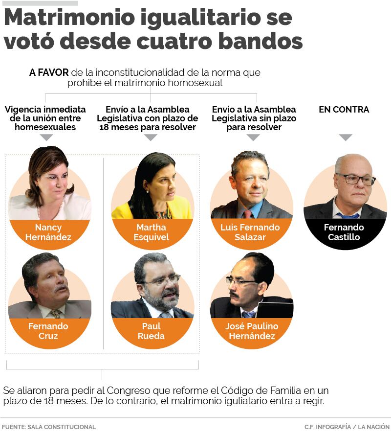 “La Sala considera que el ordenamiento costarricense requiere de ajustes, requiere de una serie de modificaciones y, para eso, le da 18 meses al Parlamento, para que haga las modificaciones, toda vez que el Código de Familia fue redactado bajo una visión de un matrimonio heterosexual”, comentó.