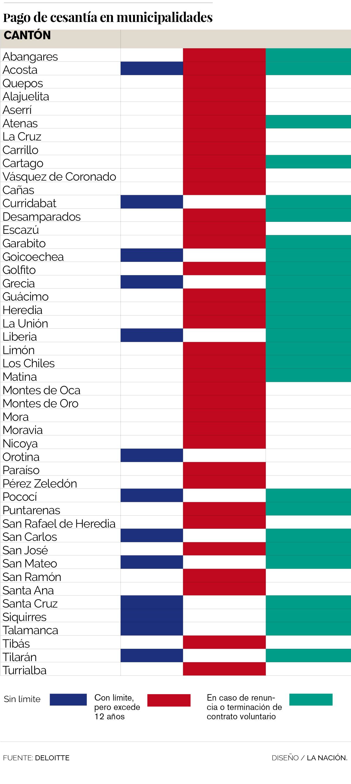 De hecho, 16 de estos gobiernos locales pagan muchos más de 12 años de cesantía. Algunas retribuyen hasta 20 años de cesantía, como son los casos de Limón, Matina y Garabito.