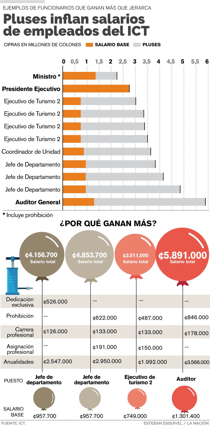 Uno de los jefes de departamento del Instituto Costarricense de Turismo (ICT) recibe cada mes un salario base de ¢958.000; sin embargo, su sueldo termina cuadruplicándose a ¢4,1 millones gracias a los pluses que recibe: ¢2,5 milones por años de servicio, ¢526.000 por dedicación exclusiva y ¢126.000 por carrera profesional.