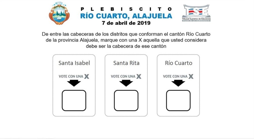 Este domingo, los 6.152 habitantes del cantón de Río Cuarto realizarán un plebiscito para elegir la cabecera de ese cantón, indicó el Tribunal Supremo de Elecciones (TSE).