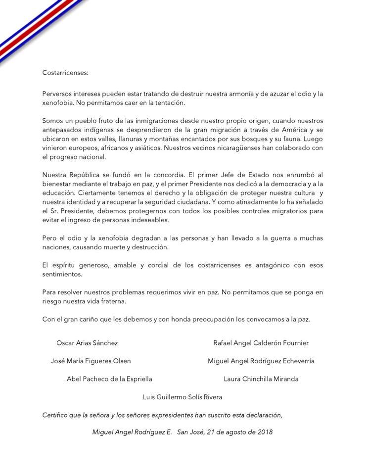 En su pronunciamiento, los expresidentes recordaron que Costa Rica es “un pueblo fruto de inmigraciones” y, por lo tanto, aunque está llamado a velar por su seguridad, debe hacerlo en forma pacífica.