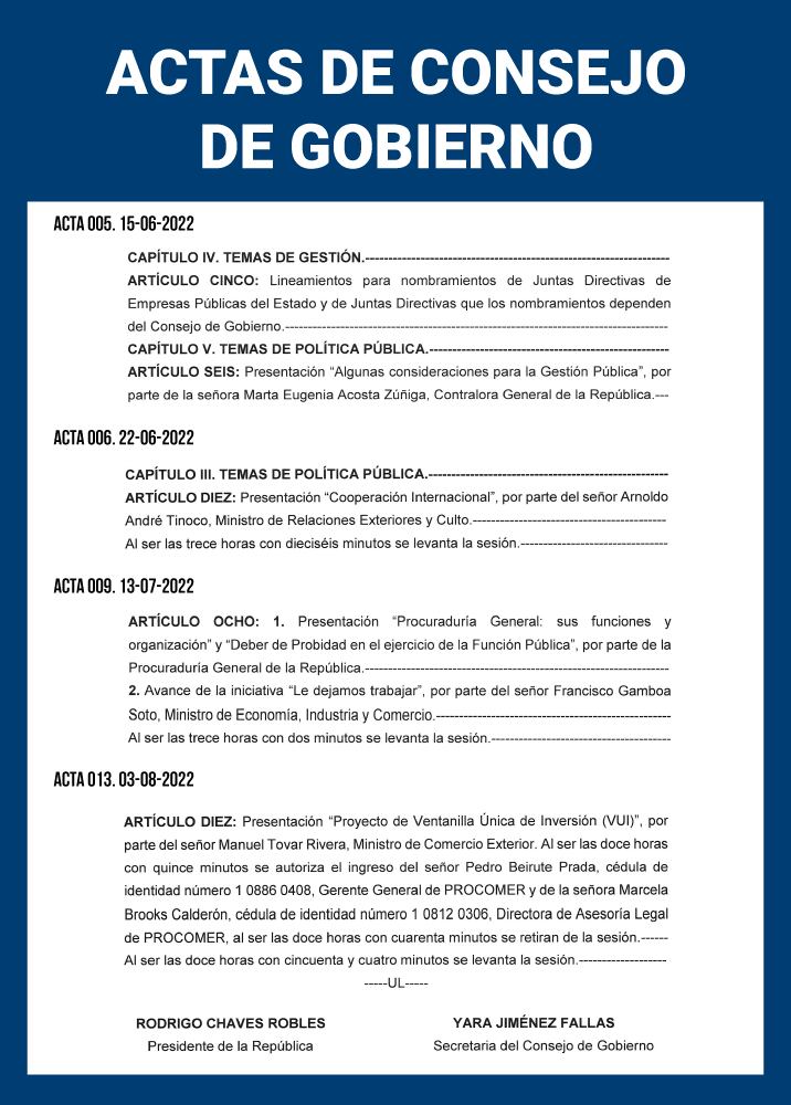 Las actas se comparten en el portal de Presidencia en cumplimiento del decreto vigente N.° 40200-MP-MEIC-MC, del 27 de abril de 2017, emitido por la administración de Luis Guillermo Solís. Sin embargo, en el sitio web presidencial solo hay registro de las actas a partir del Gobierno de Carlos Alvarado.