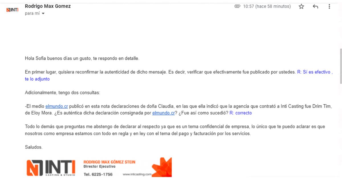 La Nación también le consultó al director de la agencia si ya recibió el pago por los servicios de casting brindados, quién realizó el pago, desde dónde se recibió el dinero y a nombre de quién se emitió la factura; no obstante, Gómez se abstuvo de responder, alegando que dicha información es confidencial por parte de la empresa.