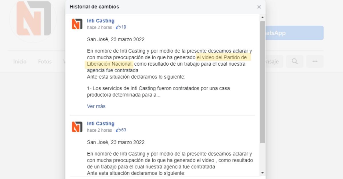 El comunicado publicado originalmente en la página Inti Casting se refería específicamente al “video del Partido de Liberación Nacional”; sin embargo, minutos después la publicación fue editada, y se eliminó la mención expresa al PLN.