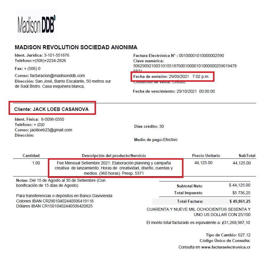 En total, está pendiente el desembolso de $113.495 (¢74,5 millones). A Madison solo se le hizo un adelanto de $20.091 (¢13,2 millones) y otro de ¢5,2 millones para pagar la pauta en los canales 6 y 7. Los pagos recibidos, según David Dumani, salieron de cuentas bancarias relacionadas con ATA Trust y el empresario Jack Loeb.