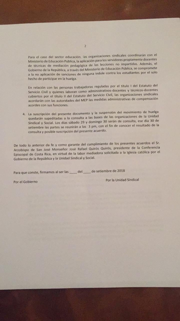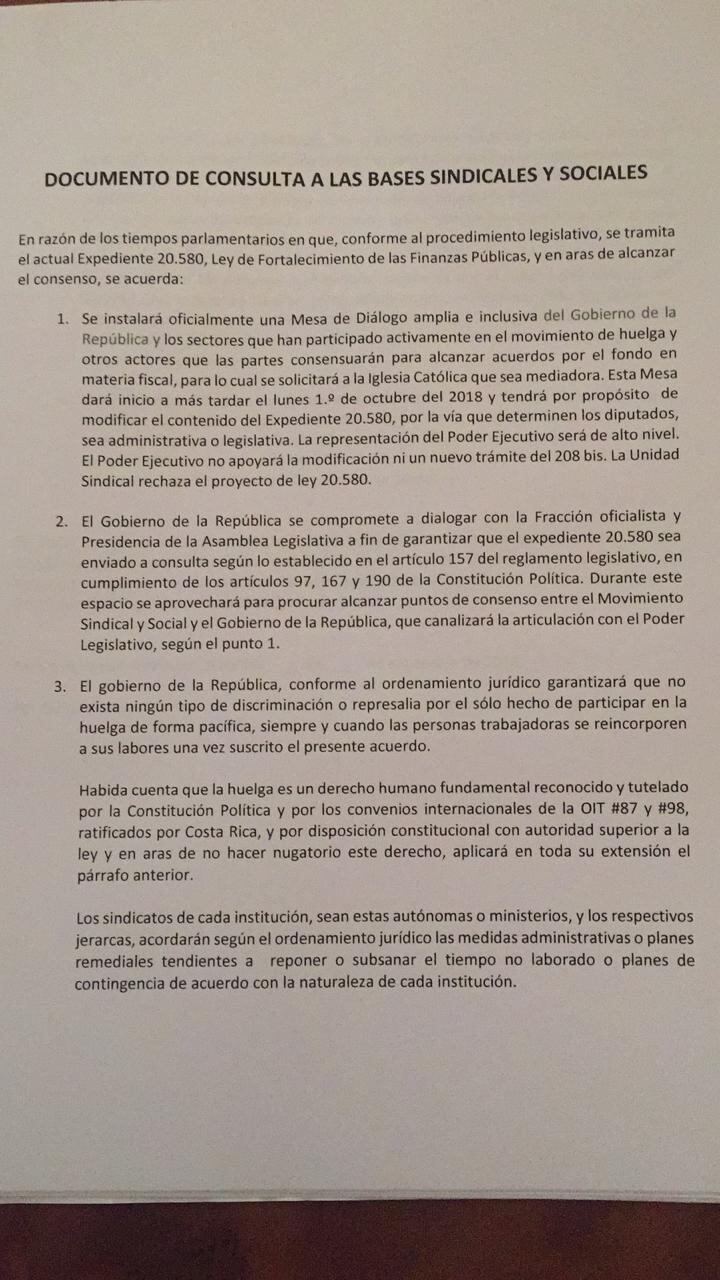 El documento establece que, apartir de este lunes, sindicatos y Gobierno iniciarían una nueva mesa de diálogo en busca de modificar el contenido del proyecto de reforma fiscal que conoce la Asamblea Legislativa bajo el expediente legislativo 20.580.