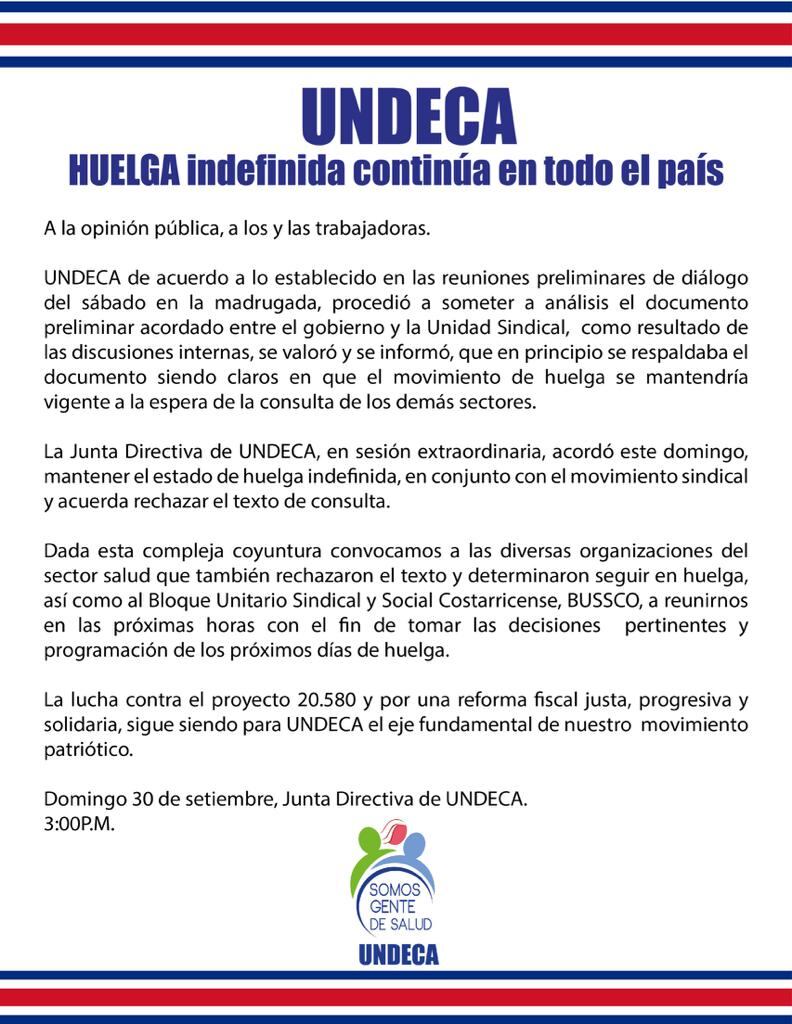 El nuevo comunicado amplía: “La Junta Directiva de Undeca, en sesión extraordinaria, acordó este domingo mantener el estado de huelga indefinida, en conjunto con el movimiento sindical, y acuerda rechazar el texto de consulta”.