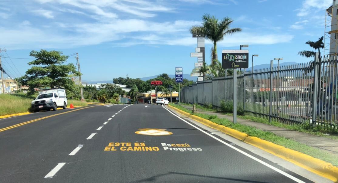 Esta ruta nacional fue intervenida por la Municipalidad de Escazú y en ella se aprecian varios rótulos y señales que destacan que la obra fue construida por el ayuntamiento.