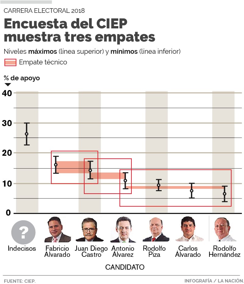 "Están todos tan juntitos que los intervalos de confianza están cerca y por eso hablamos casi que de un triple empate: hay empate en la punta, hay empate por el segundo lugar entre Antonio Álvarez Desanti y Juan Diego Castro, pero también hay un empate por el tercer lugar entre Álvarez, Piza, Alvarado y Hernández", explicó Felipe Alpízar, director del Centro de Investigación y Estudios en Política (CIEP), encargado de elaborar la encuesta.