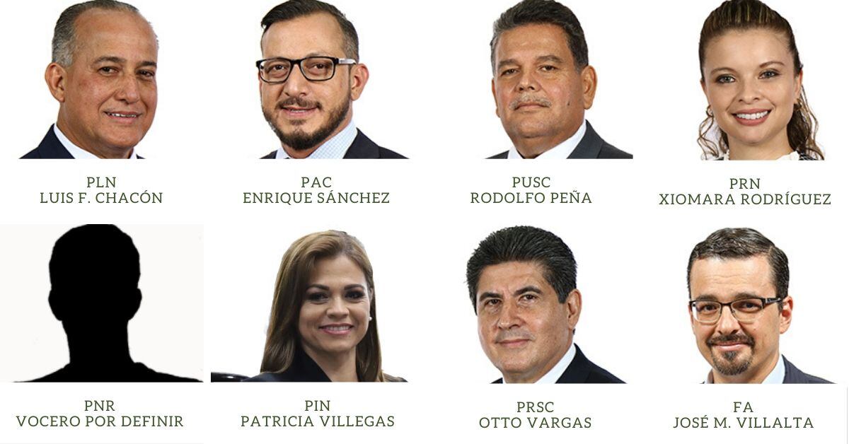 El de Liberación Nacional (PLN) será Luis Fernando Chacón; el de Acción Ciudadana (PAC), Enrique Sánchez; el de la Unidad Social Cristiana (PUSC), Rodolfo Peña; y la de Restauración Nacional (PRN), Xiomara Rodríguez.