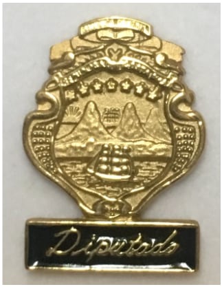 Los pines de oro llevan el escudo de Costa Rica con la palabra diputado o diputada en la parte inferior. El tamaño del pin es de 33 milímetros de alto por 15 milímetros de ancho, de oro sólido de 14 quilates, con un peso aproximado de 3,4 gramos.