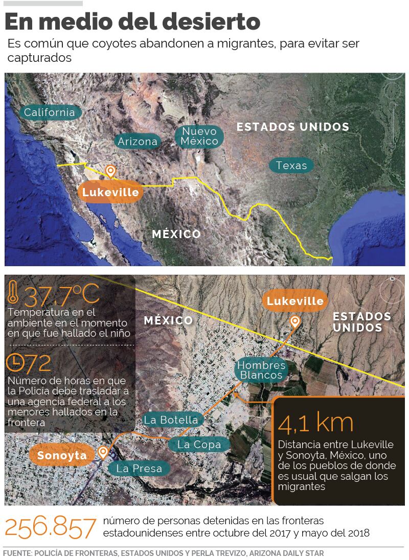 Trevizo explicó que los núcleos familiares que intentan cruzar por la zona, en la que fue encontrado el menor costarricense, suelen salir de un pueblo mexicano llamado Sonoyta, ubicado a cuatro kilómetros de Lukeville.