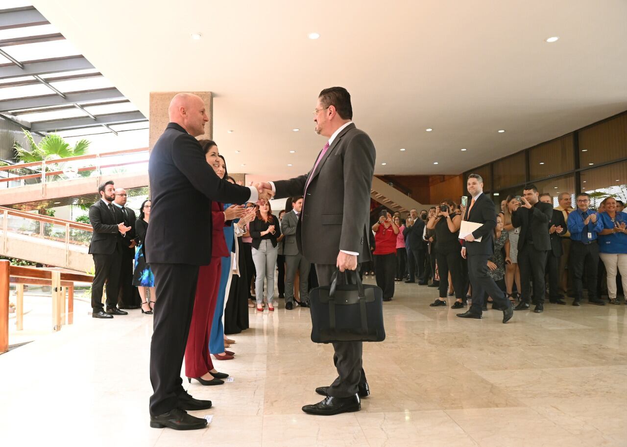Chaves llegó a las 12:30 p. m. de este lunes, escoltado por oficiales de la Policía de Tránsito y con un pequeño de bolso de mano. A su entrada, fue recibido entre aplausos por los trabajadores de Casa Presidencial.