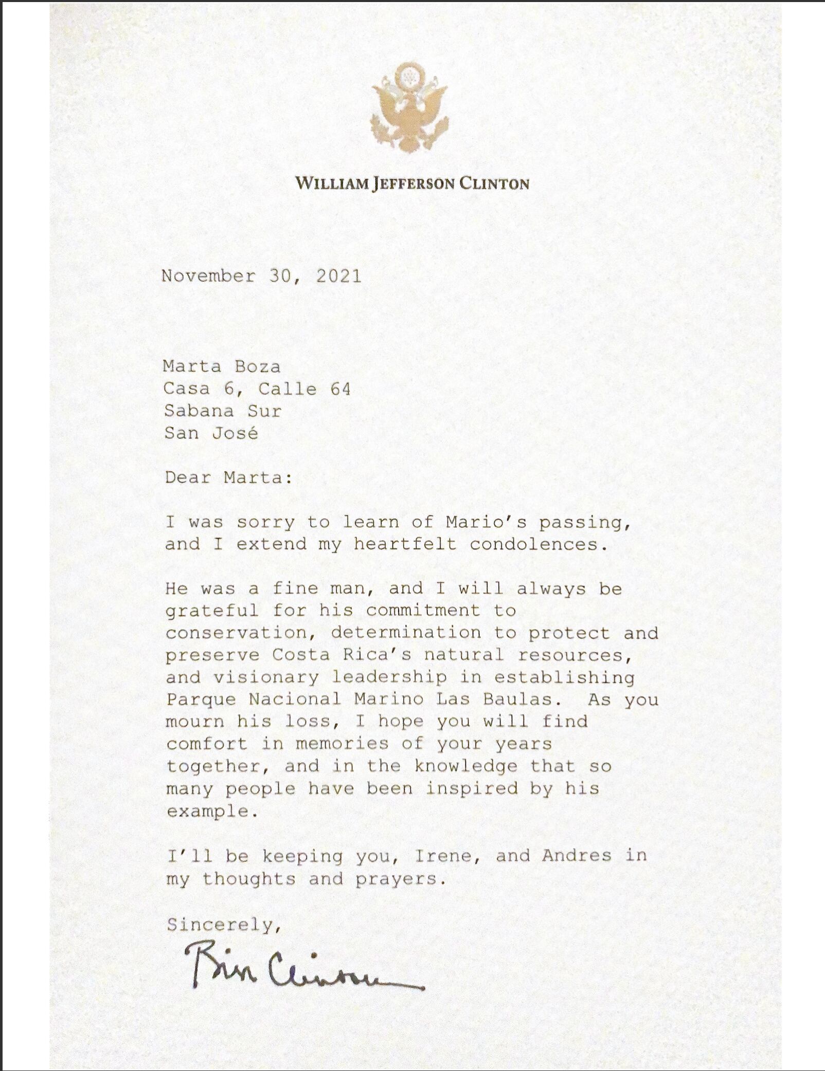 El expresidente de Estados Unidos, William Jefferson “Bill” Clinton, envió un mensaje de condolencias a la familia de Mario Andrés Boza Loría, uno de los padres de los parques nacionales en Costa Rica quien falleció el 29 de octubre pasado a los 79 años debido a un cáncer.