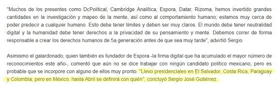 Aunado a ello, en marzo del 2018, en un artículo publicado en la web del diario mexicano Reforma, el dueño Espora, Sergio José Gutiérrez, reconoció que estaba trabajando en las elecciones costarricenses cuando le preguntaron sobre las asesorías actuales y sobre con cuál candidato iba a trabajar en los pasados comicios de su país natal.
