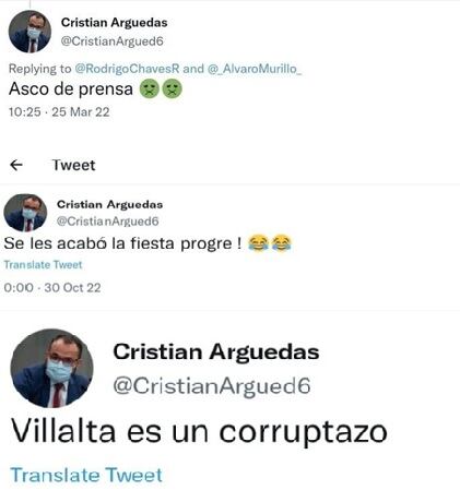 En otras publicaciones, Arguedas escribió: “Villalta es un corruptazo”. Eso lo redactó el 18 de marzo anterior, en respuesta a un tuit del periodista Diego Delfino, quien, entre otras cosas, mencionaba que el entonces diputado del FA, José María Villalta, utilizaba la gasolina del Congreso, a pesar de que no tenía un vehículo.