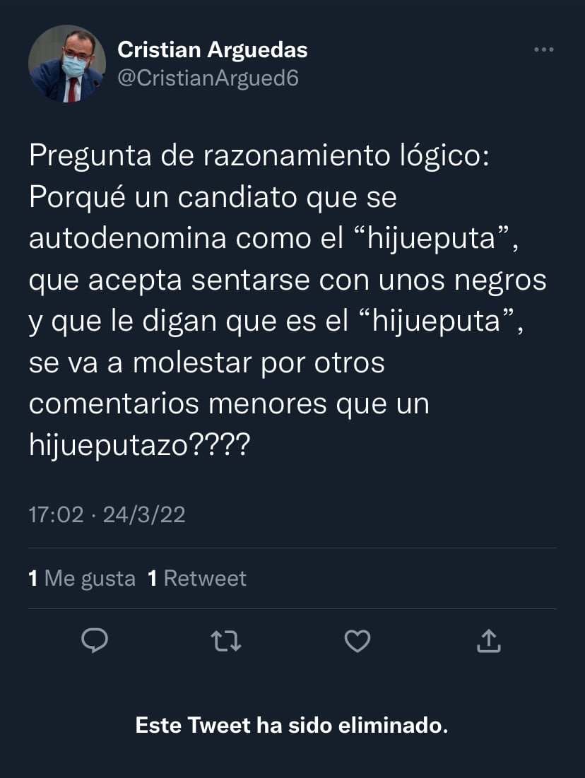 El 24 de marzo del 2022, Cristian Arguedas escribió, por ejemplo: “Pregunta de razonamiento lógico: ¿Por qué un candidato que se autodenomina como el ‘hijueputa’, que acepta sentarse con unos negros y que le digan que es el ‘hijueputa’, se va a molestar por otros comentarios menores que un hijueputazo?”.
