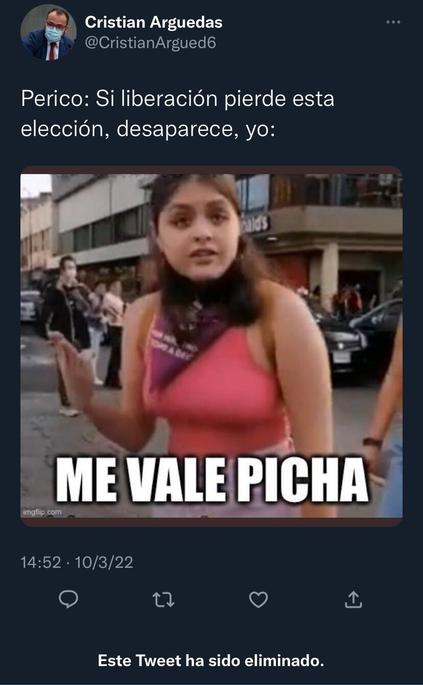 El 10 de marzo, también del 2022, escribió: “Perico (sinónimo de liberacionista): Si Liberación pierde esta elección, desaparece, yo:”. Y de seguido aparece la imagen de una mujer con la frase: “Me vale picha”.