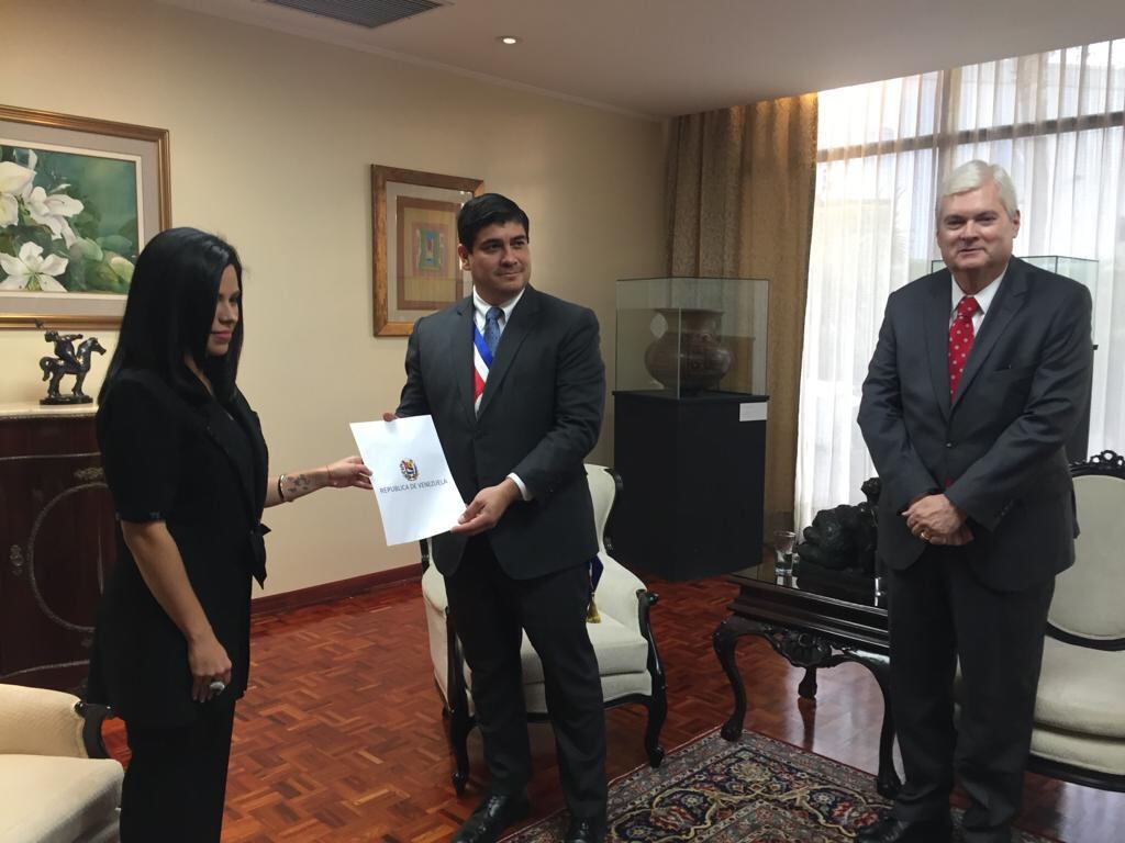 Farías presentó la noche del miércoles las cartas credenciales al presidente Alvarado, que la acreditan como la nueva representante venezolana en el país. En la actividad, en Casa Presidencial, estuvo presente el canciller Manuel ventura.